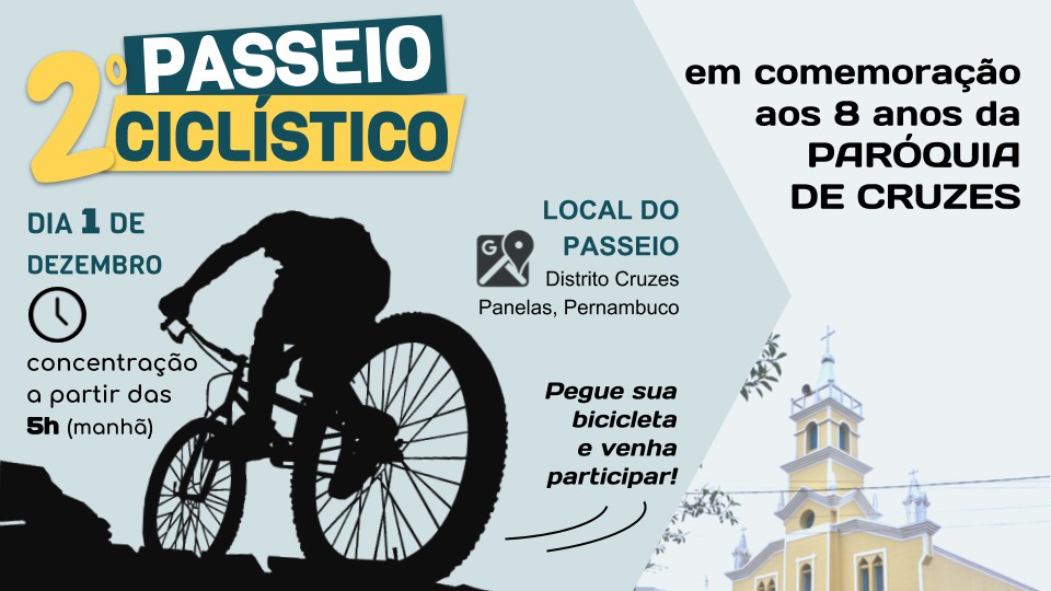 O evento é em comemoração aos 8 anos da PARÓQUIA DE CRUZES, está marcado para acontecer no dia 01 de Dezembro. É um evento aberto para qualquer um com uma bicicleta participar. Os organizadores disponibilizaram um Kit (uma camisa e café da manhã no momento da concentração) para os que desejarem.