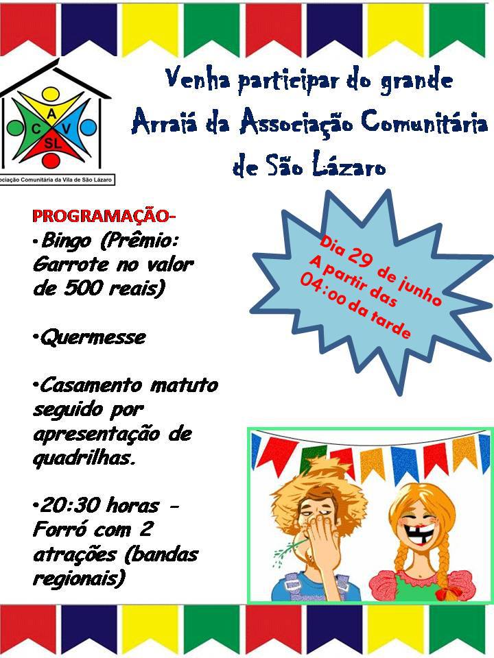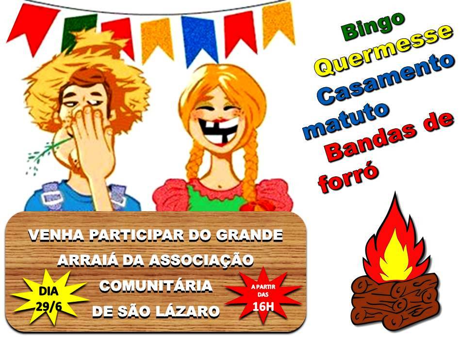 Venha participar do Arraiá da Associação Comunitária de São Lazaro, é neste sábado (29) a partir das 16:00h, estão todos convidados para esta festa matuta.