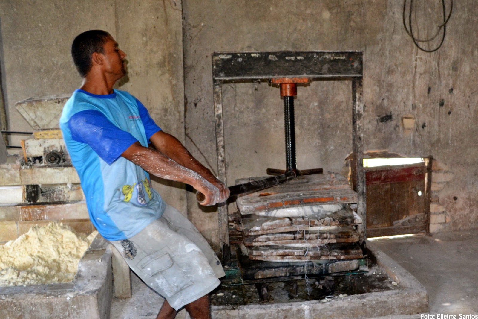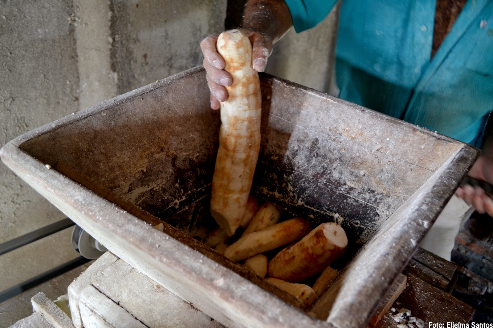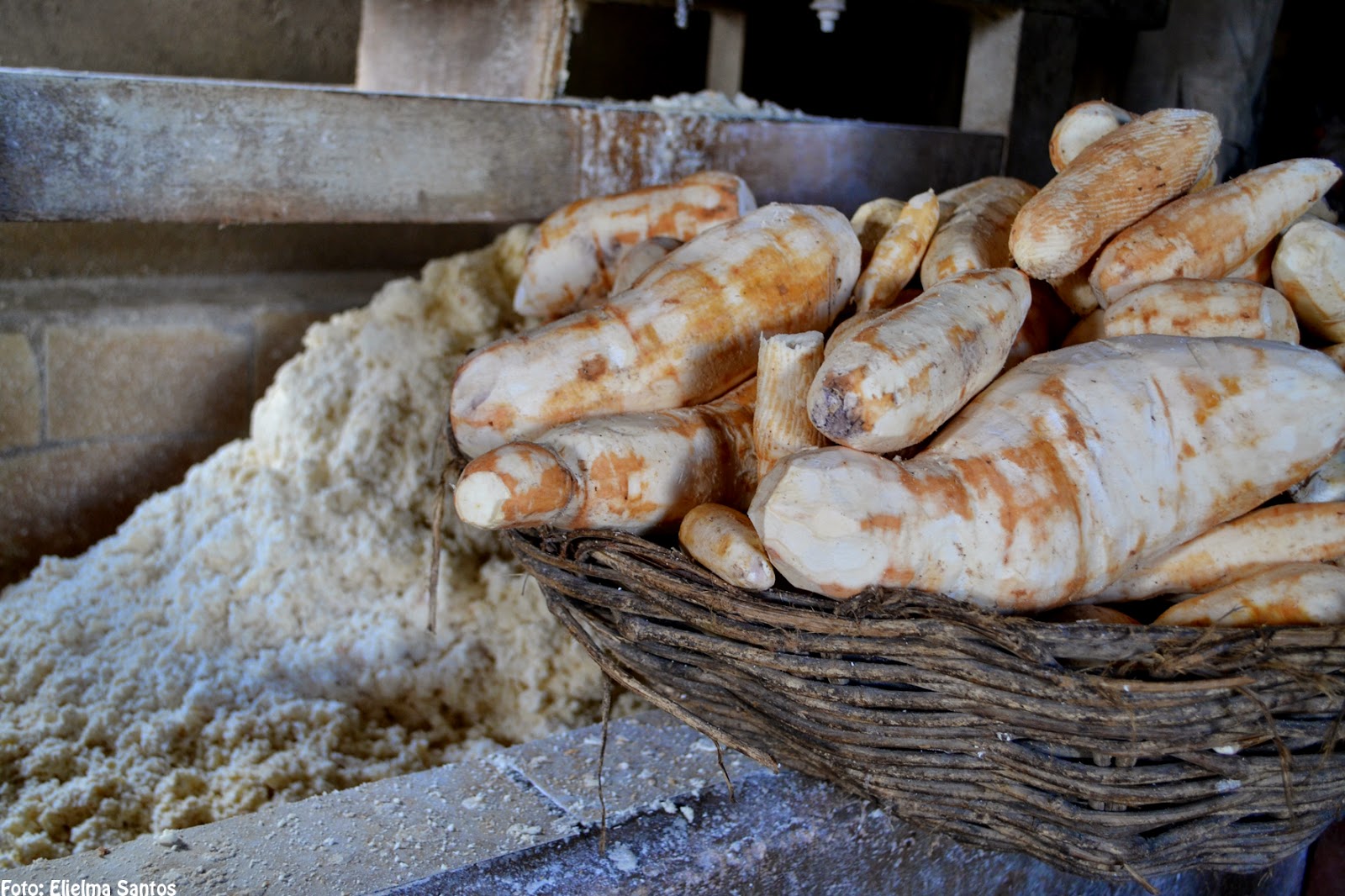 Depois da colheita da raiz, a mandioca é levada direito da roça para a casa de farinha, onde é descascada em seguida, é triturada ou ralada em pilão ou no ralador ou coetatu. A mandioca ralada vai caindo em um cocho, sendo depois prensada na prensa para retirar um líquido venenoso chamado manipueira. Depois de peneirada e torrada, a farinha está pronta para o consumo. Além da massa “puba” para a fabricação de  bolos einda é produzido o beiju e a massa para tapioca.