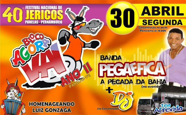 É no dia 30 de Abril a partir da 18:00h, fazendo parte da programação do 40º Festival Nacional de Jericos. Com direito a trio elétrico, DJ na concentração e haverá sorteio de camisas do Bloco aqui no Blog.