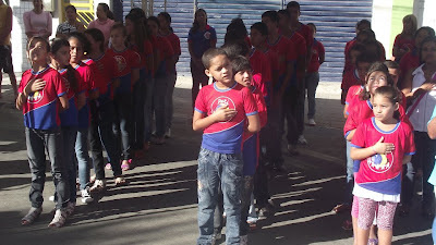 As crianças do PETI cantando o Hino durante o hasteamento.