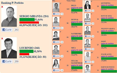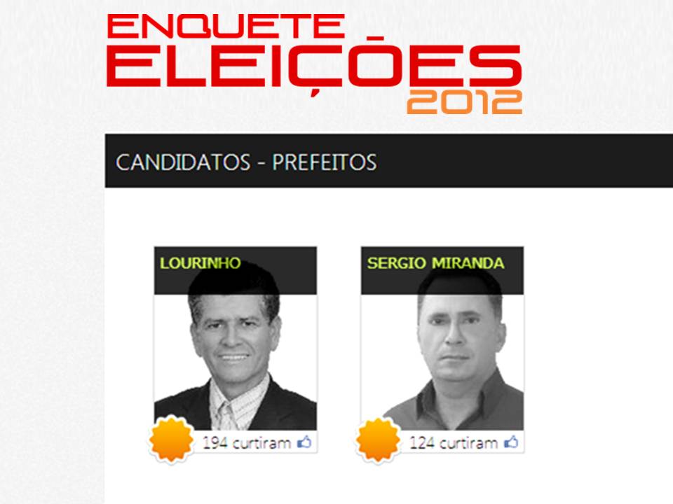 A segunda enquete é mais simples que a primeira, apesar de ser uma página externa, a mesma usa ferramentas do facebook para calcular o numero de votos, neste caso são os curtis dos usuários que são computados e gerado o resultado. Lourinho fica na frente (194 curtiram) de Sérgio Miranda (124 curtiram) com uma diferença de 70 pontos.