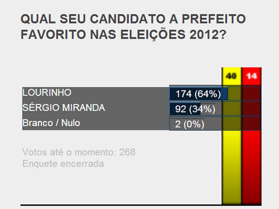 Por terceira e ultima, temos o resultado da enquete do Blog “Qual seu candidato favorito nas Eleições 2012?. Uma enquete livre e aberta com uma pergunta baseada no candidato favorito. LOURINHO obteve 174 votos, enquanto SÉRGIO MIRANDA teve apenas 92, a enquete passou uma semana disponível para votação e teve mais de 260 participações aqui na página do Blog, foi encerrada em 05/10/2012 a partir das 20:00 horas. Agradecemos a todos que participaram.