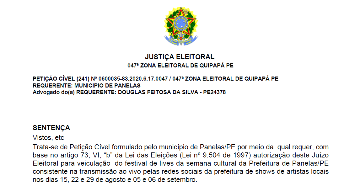 O resultado não demorou para vir à luz; a sentença foi publicada e a verdade apareceu: não foi ninguém da oposição que fez alguma coisa para impedir a live dos artistas, mas a própria prefeitura que pediu um parecer a justiça eleitoral, e sinceramente; a forma como organizou deixou claro para qualquer um que intenda o mínimo de direito que a intenção era não fazer mesmo. Se você, caro leitor, acha que não pode piorar é bom esperar, pois piora mais ainda. Mentir sobre a live dos artistas e seu impedimento foi pouco.