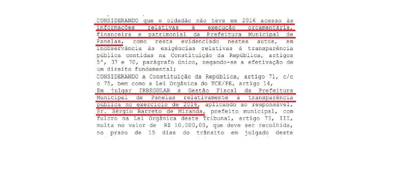 “CONSIDERANDO que tais máculas, em recente diagnóstico sobre a transparência governamental elaborado por este Tribunal de Contas nos Municípios (disponível em www.tce.pe.gov.br/indicedetransparencia), redundaram na classificação “Crítico” no índice de transparência da Prefeitura de Panelas, que perfez tão somente 75,00 pontos de 1.000 possíveis e representa uma precária disponibilização de dados à sociedade;