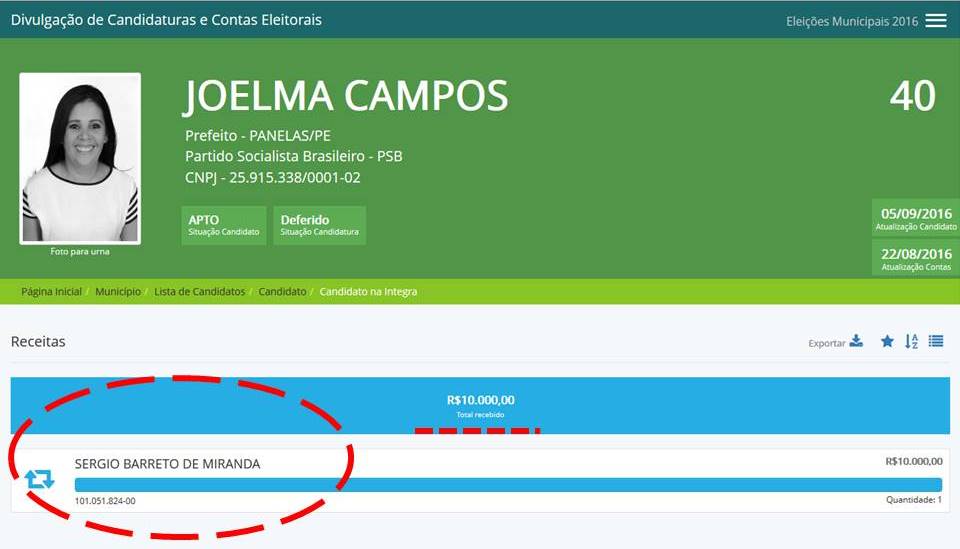 O Prefeito de Panelas-PE, Sérgio Barreto de Miranda, fez uma doação de R$ 10 mil para a campanha de Joelma Campos nas Eleições Municipais 2016.