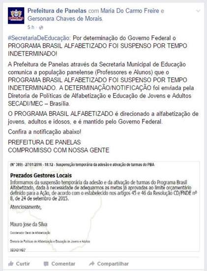 A Prefeitura de Panelas através da Secretaria Municipal de Educação comunica a população panelense (Professores e Alunos) que o PROGRAMA BRASIL ALFABETIZADO FOI SUSPENSO POR TEMPO INDETERMINADO. A DETERMINAÇÃO/NOTIFICAÇÃO foi enviada pela Diretoria de Políticas de Alfabetização e Educação de Jovens e Adultos SECADI/MEC – Brasília” (…)